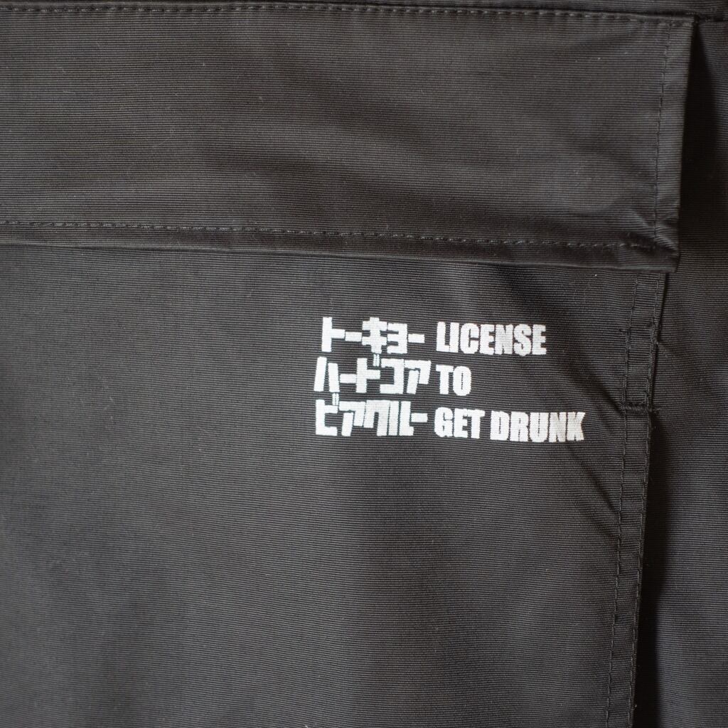 フロントのビッグポケットにロゴと酔っぱらいのライセンスをプリント。